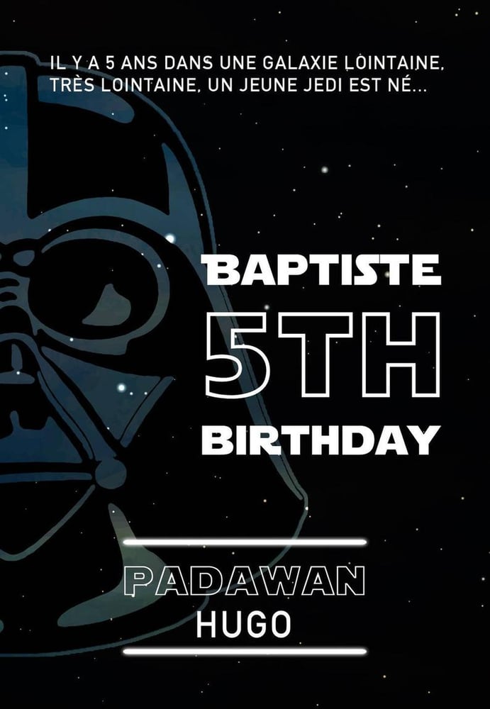 ( les invitations foot sur la photo étaient pour l'anniversaire de mon grand qui fétait ces 8 ans une semaine plus tard Je vous ferais également un article sur ce thème) J'ai acheté des cartes blanches basiques et j'ai donc choisi de télécharger sur le site Dafont une police d'écriture Star Wars Puis d'adapter le texte à la situationUne invitation Star Wars pour votre anniversaire drôle et surprenant invitez vos amis à voyager dans la guerre des étoiles pour votre anniversaire Insérez votre photo on s'occupe de la mise en page Description produit Format 11x14 cm Impression qualité photo « Pour mon anniversaire, invité tu es (ne pas oublier d'écrire INVITEE si l'invit est pour une fille – oups !) le xxx de xxx à xxx « J'ai téléchargé la police star wars, chopé un sabre laser sur le net (ouh c'est pas bien) et rajouté un fond noir
